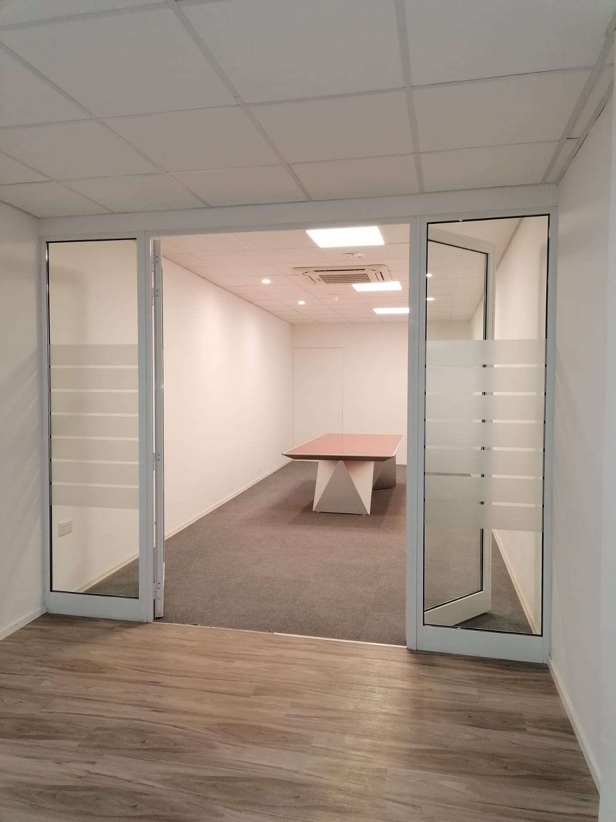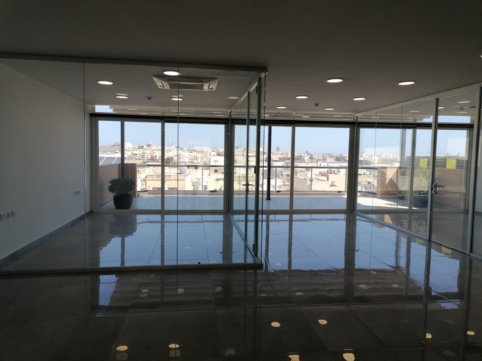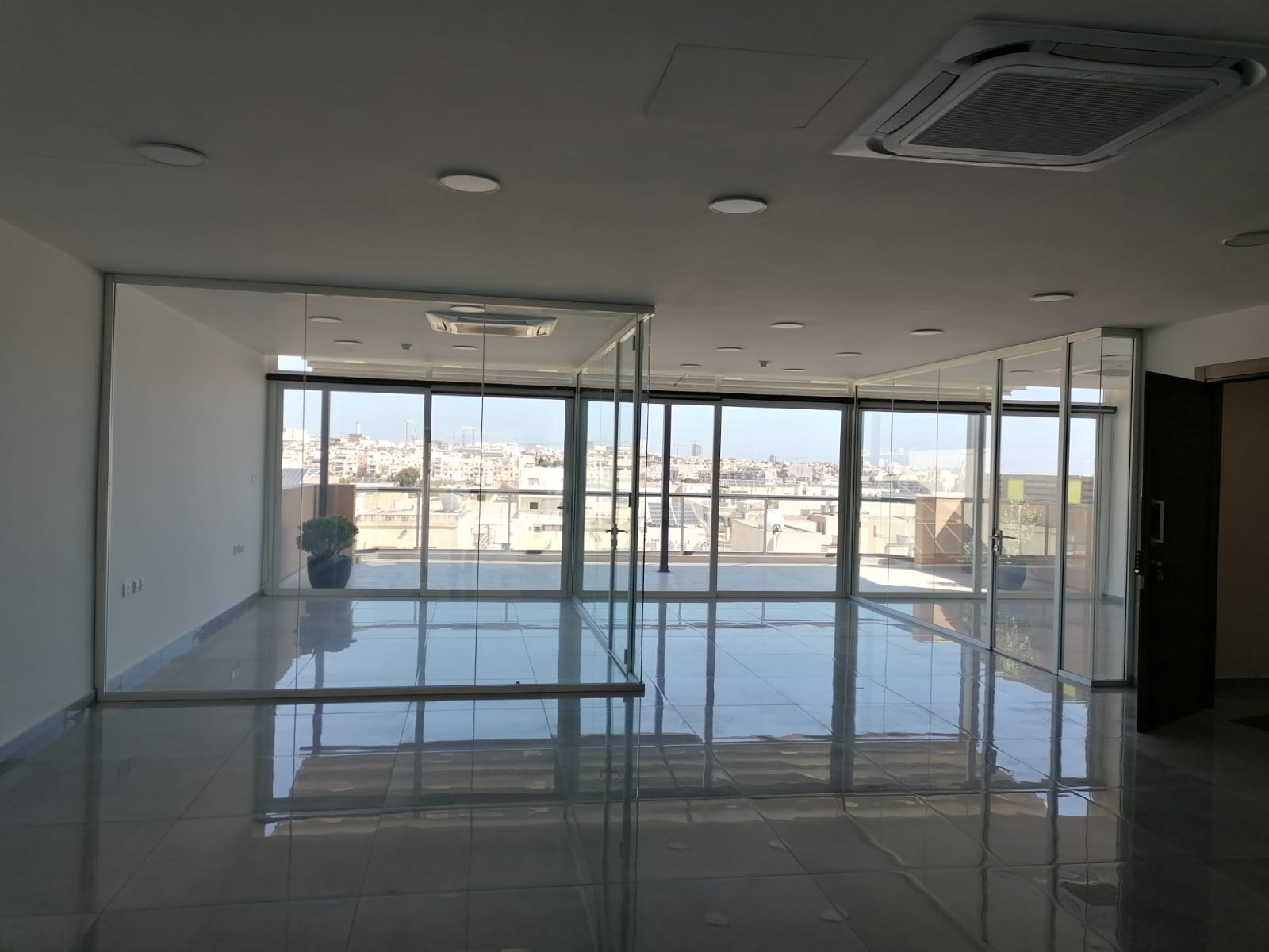 Each floor is currently divided into multiple rooms using glass and gypsum partitions, which can easily be removed to convert to an open plan, comes with four bathrooms, fully serviced kitchen, and fully air conditioned throughout.